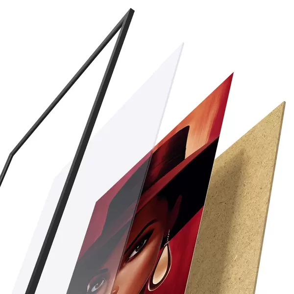 Das Poster besteht aus einem Rahmen, Plexiglas, einem gedruckten Bild und einer Rückwand aus Spanplatten. Dank der Halterungen auf der Rückseite kann das Poster sofort an die Wand gehängt werden.