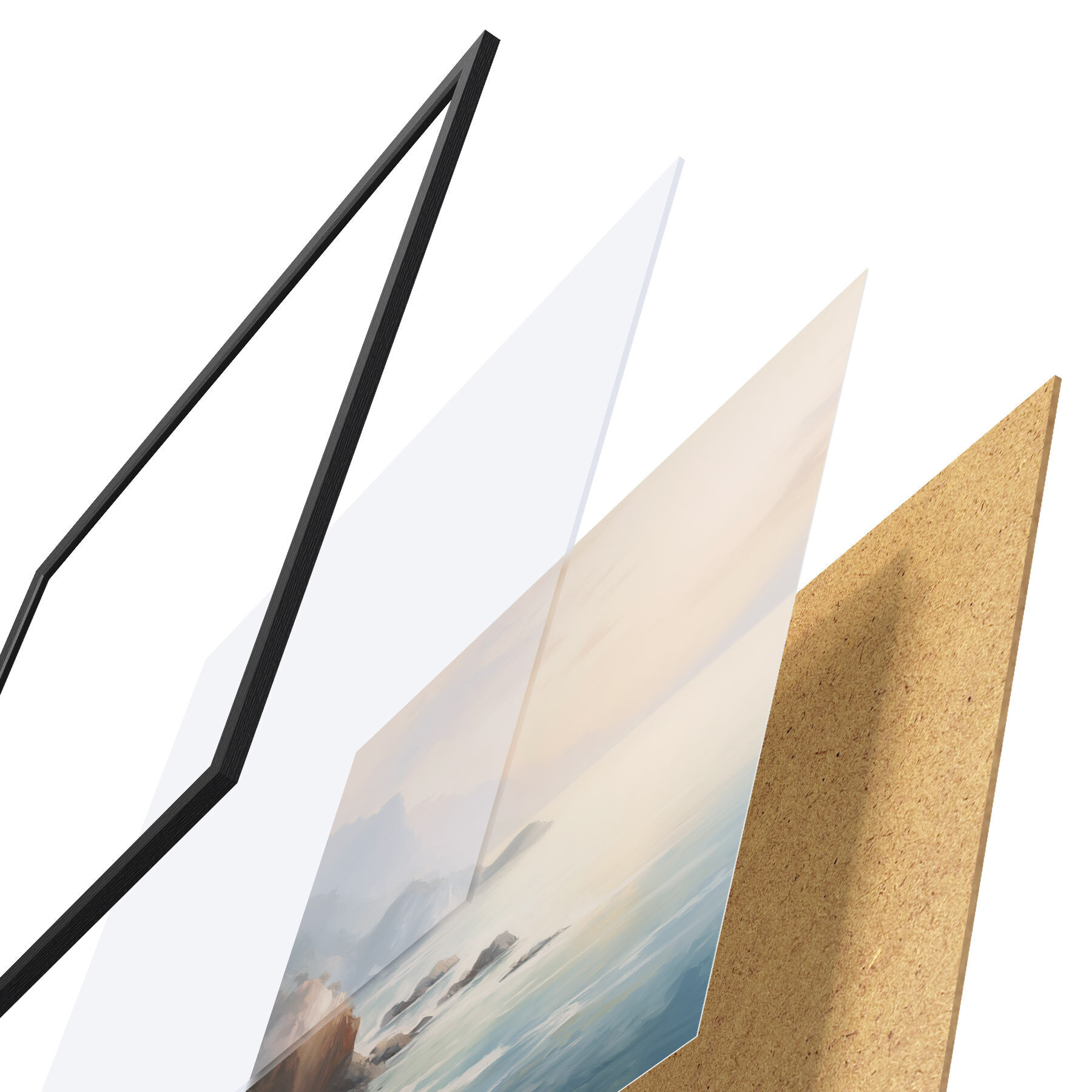 Das Poster besteht aus einem Rahmen, Plexiglas, einem gedruckten Bild und einer Rückwand aus Spanplatten. Dank der Halterungen auf der Rückseite kann das Poster sofort an die Wand gehängt werden.