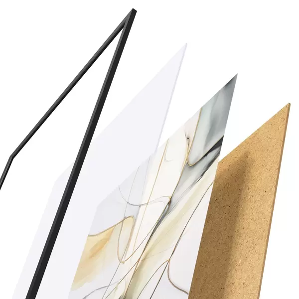 Das Poster besteht aus einem Rahmen, Plexiglas, einem gedruckten Bild und einer Rückwand aus Spanplatten. Dank der Halterungen auf der Rückseite kann das Poster sofort an die Wand gehängt werden.