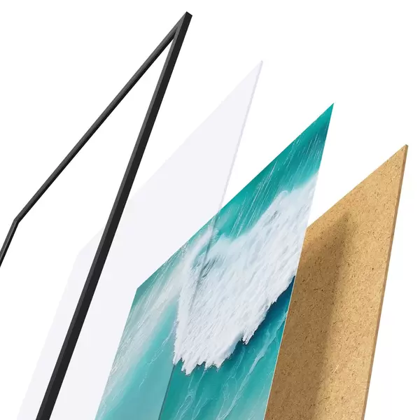Das Poster besteht aus einem Rahmen, Plexiglas, einem gedruckten Bild und einer Rückwand aus Spanplatten. Dank der Halterungen auf der Rückseite kann das Poster sofort an die Wand gehängt werden.