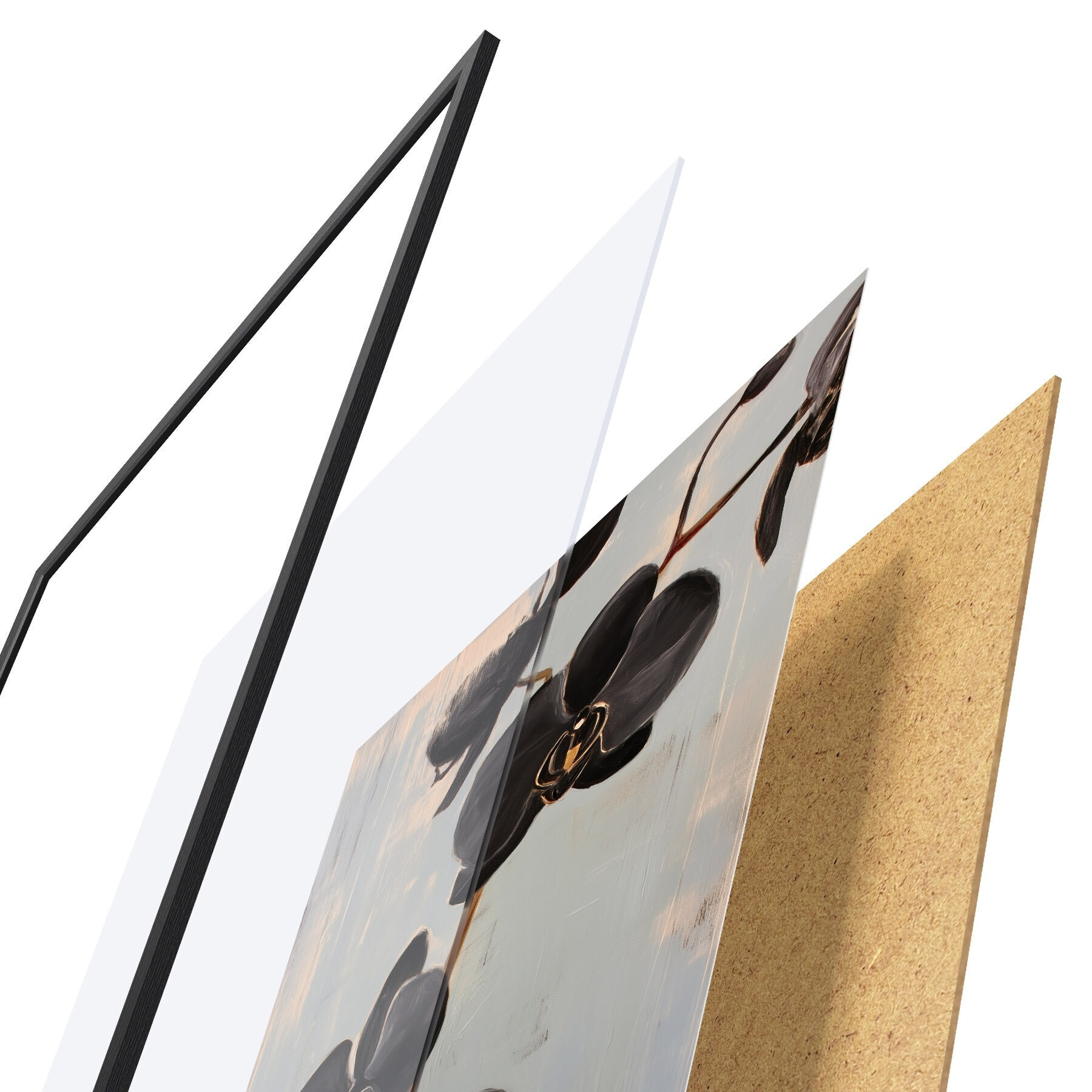 Das Poster besteht aus einem Rahmen, Plexiglas, einem gedruckten Bild und einer Rückwand aus Spanplatten. Dank der Halterungen auf der Rückseite kann das Poster sofort an die Wand gehängt werden.