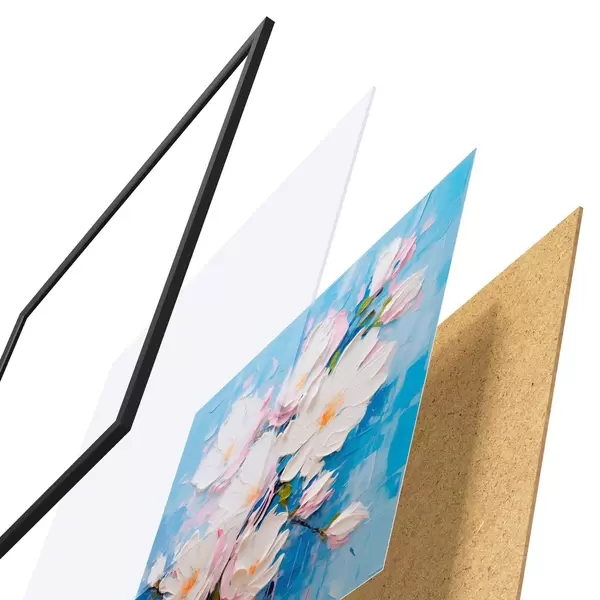 Das Poster besteht aus einem Rahmen, Plexiglas, einem gedruckten Bild und einer Rückwand aus Spanplatten. Dank der Halterungen auf der Rückseite kann das Poster sofort an die Wand gehängt werden.