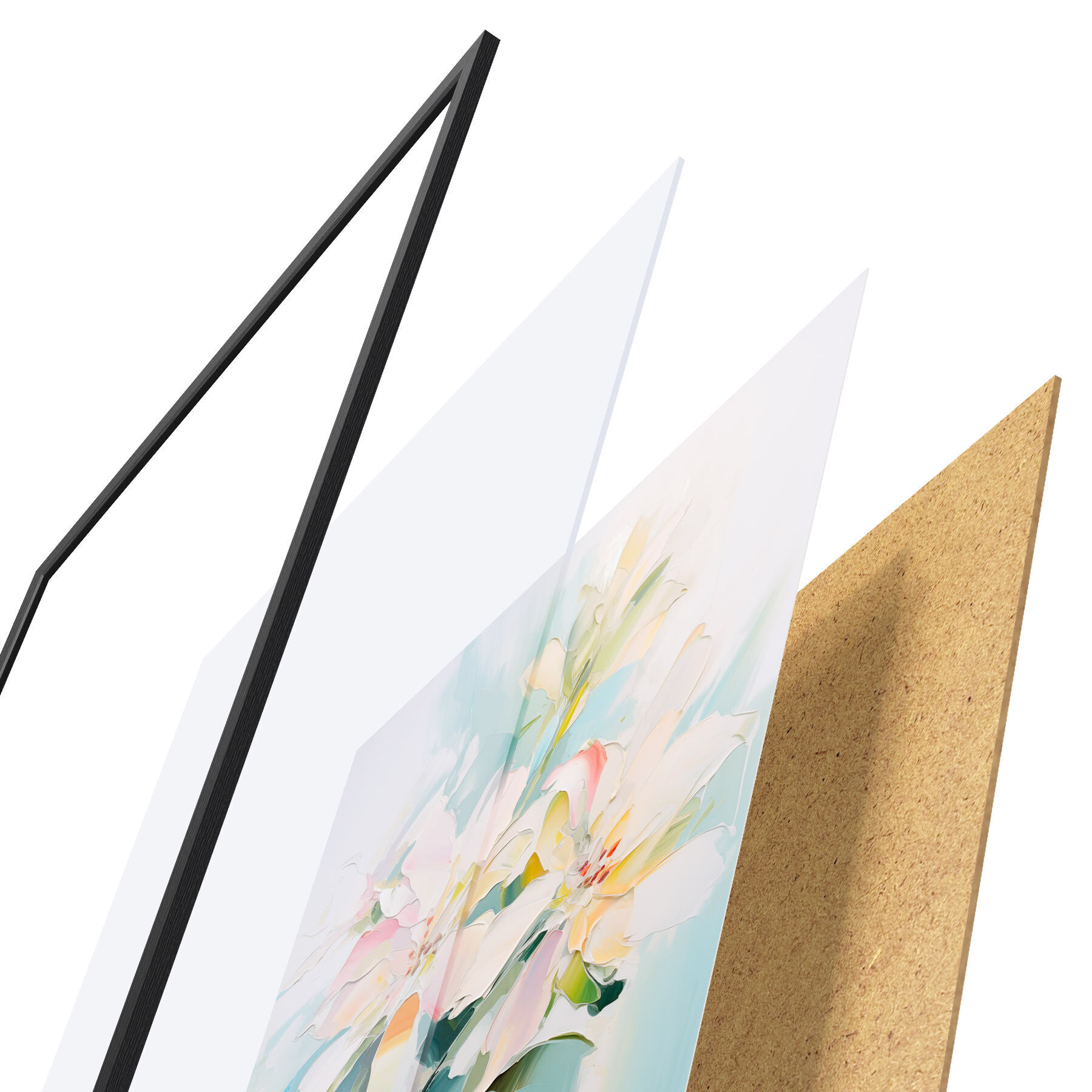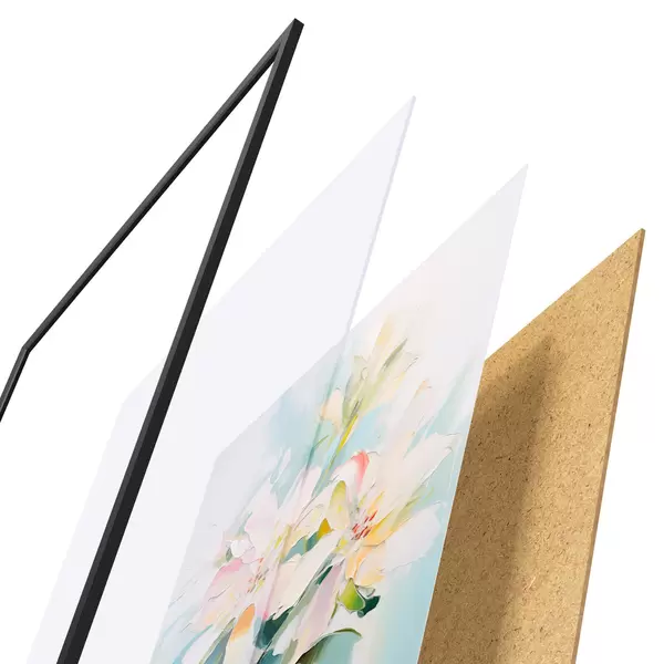 Das Poster besteht aus einem Rahmen, Plexiglas, einem gedruckten Bild und einer Rückwand aus Spanplatten. Dank der Halterungen auf der Rückseite kann das Poster sofort an die Wand gehängt werden.