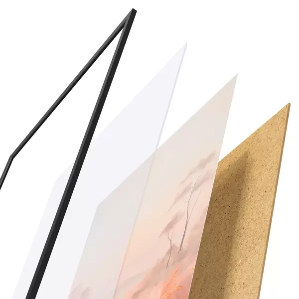 Das Poster besteht aus einem Rahmen, Plexiglas, einem gedruckten Bild und einer Rückwand aus Spanplatten. Dank der Halterungen auf der Rückseite kann das Poster sofort an die Wand gehängt werden.
