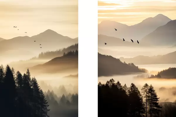 Poster Eine Berglandschaft mit einem Wald und Vögeln fliegen in den Himmel, alle in einer dicken Schicht von Nebel während des Sonnenaufgangs bedeckt Nr d00651