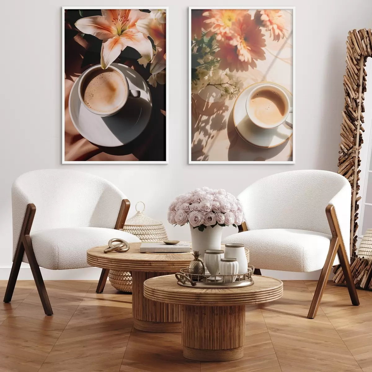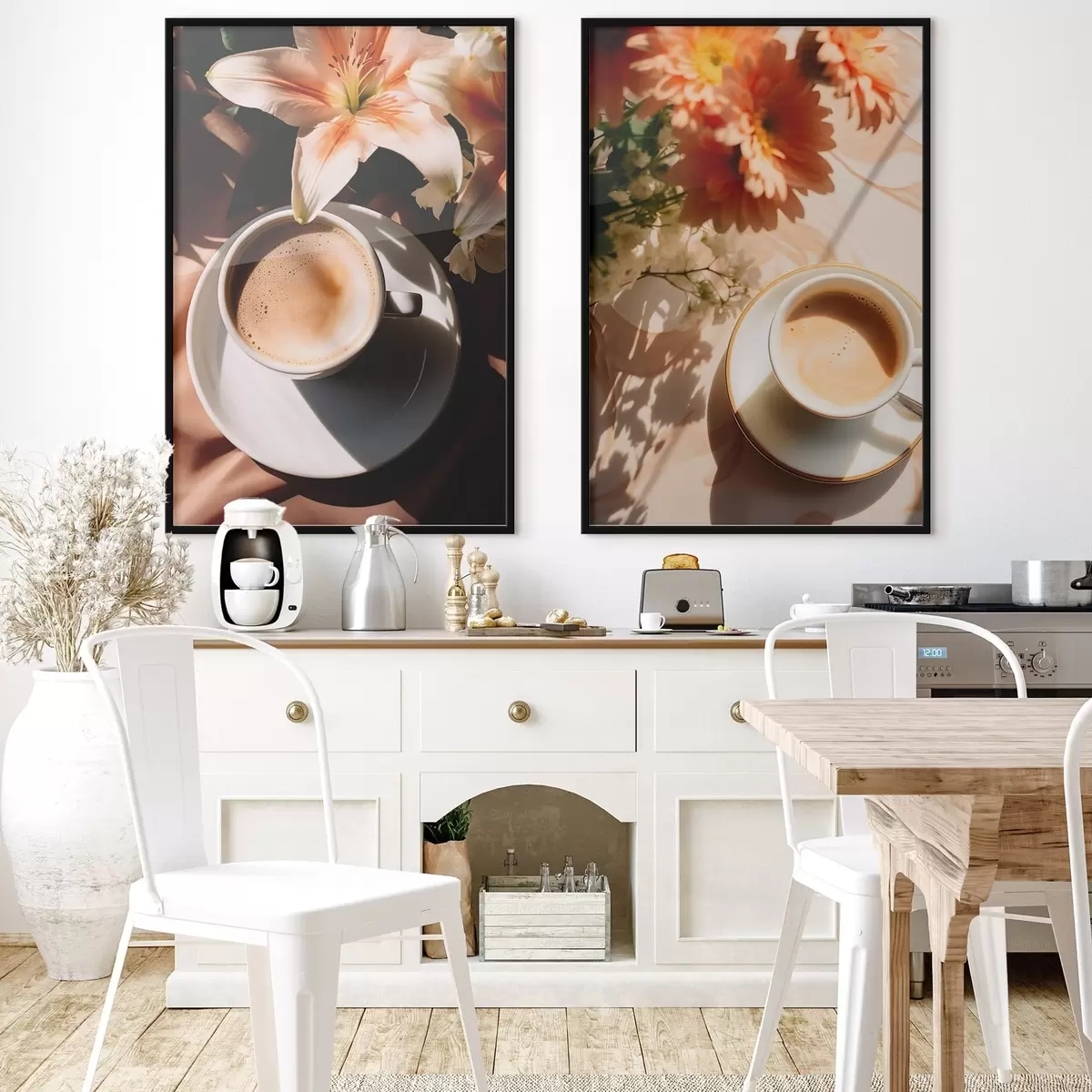 Poster Eine Tasse Kaffee mit Schaum auf einem weißen Teller, einige Blumen im Hintergrund, mit Sonnenlicht Nr d00654