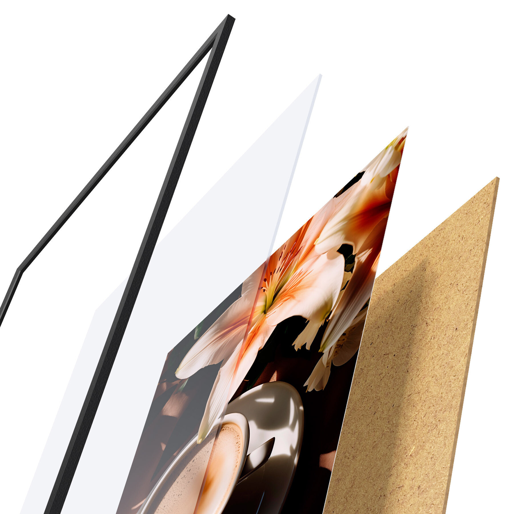 Das Poster besteht aus einem Rahmen, Plexiglas, einem gedruckten Bild und einer Rückwand aus Spanplatten. Dank der Halterungen auf der Rückseite kann das Poster sofort an die Wand gehängt werden.