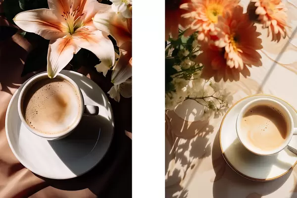 Poster Eine Tasse Kaffee mit Schaum auf einem weißen Teller, einige Blumen im Hintergrund, mit Sonnenlicht d00654