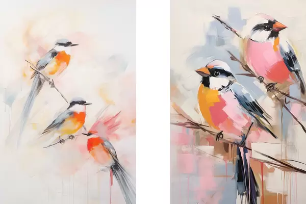 Poster Vögel auf Zweigen, weiche Pastellfarben, heller Hintergrund mit rosa und weißen Farbtönen Nr d00658
