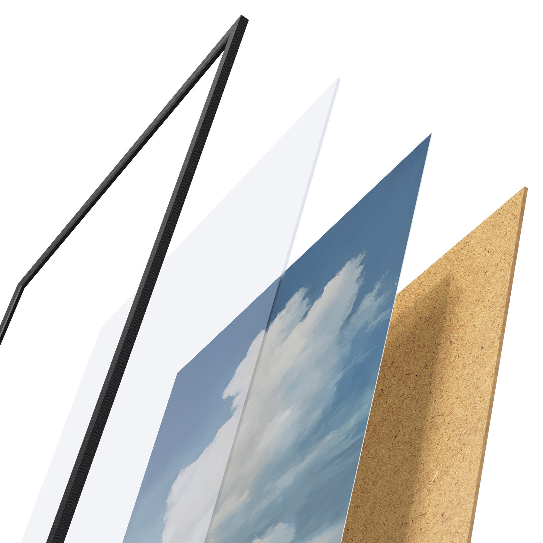 Das Poster besteht aus einem Rahmen, Plexiglas, einem gedruckten Bild und einer Rückwand aus Spanplatten. Dank der Halterungen auf der Rückseite kann das Poster sofort an die Wand gehängt werden.
