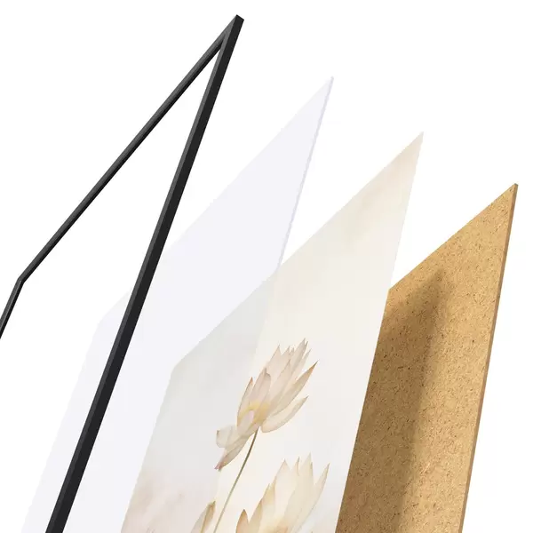 Das Poster besteht aus einem Rahmen, Plexiglas, einem gedruckten Bild und einer Rückwand aus Spanplatten. Dank der Halterungen auf der Rückseite kann das Poster sofort an die Wand gehängt werden.