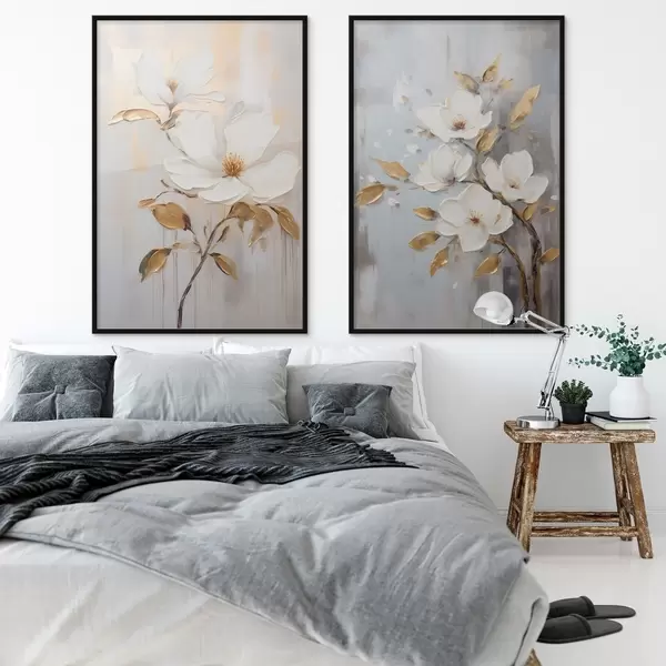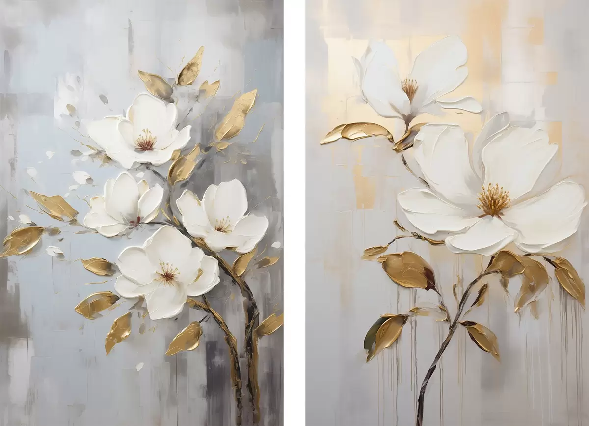 Poster Zwei weiße Blüten mit gelb-orangefarbenen Blättern auf hellem Hintergrund Nr d00687