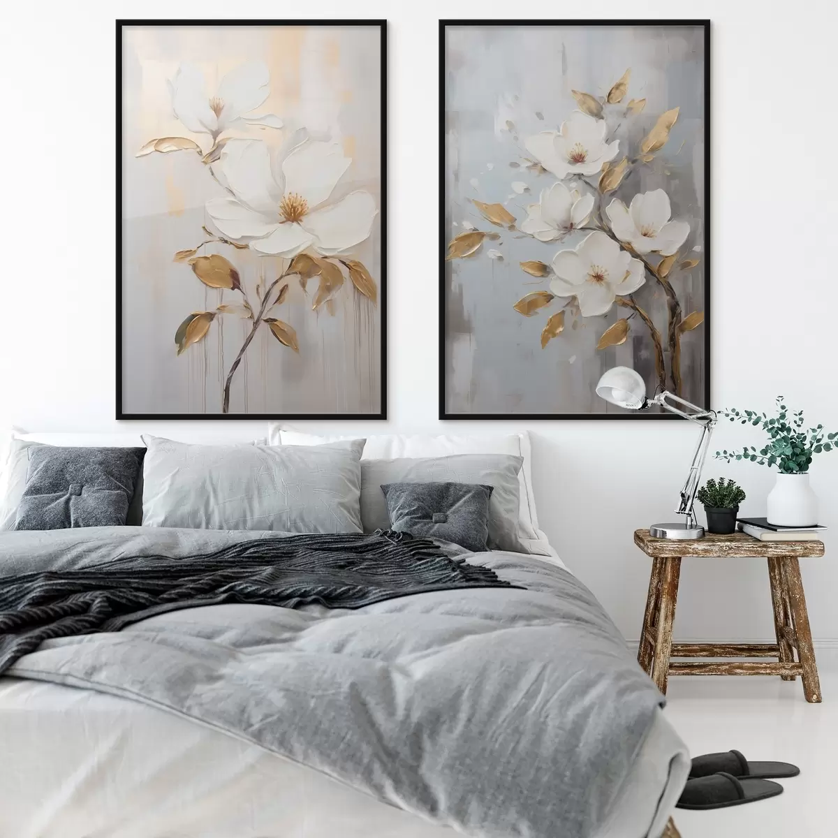 Poster Zwei weiße Blüten mit gelb-orangefarbenen Blättern auf hellem Hintergrund d00687