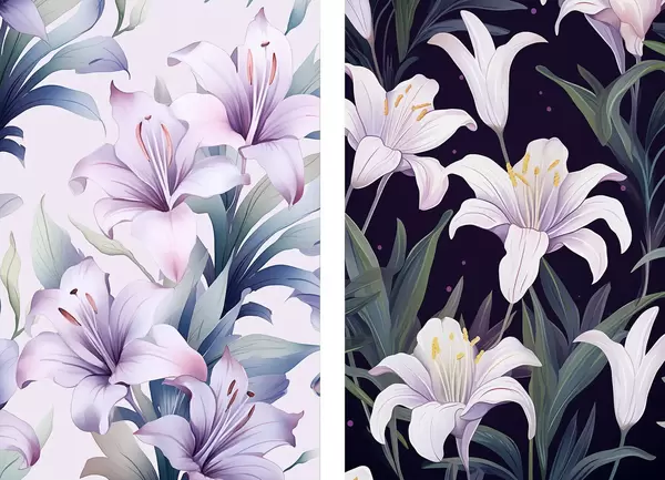 Poster Zarte rosa Lilien mit grünen Blättern auf hellem und dunklem Hintergrund Nr d00689