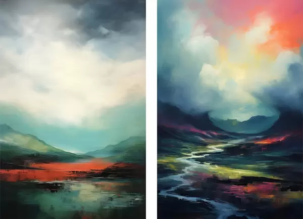 Poster Abstrakte Landschaft mit Wolken in Türkis- und Rottönen Nr d00691