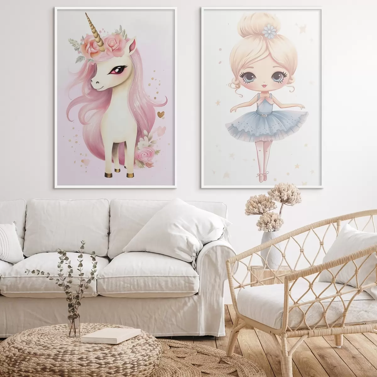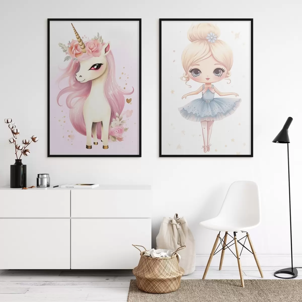 Poster Ballerina-Puppe im blauen Kleid und Einhorn mit rosa Mähne d00692