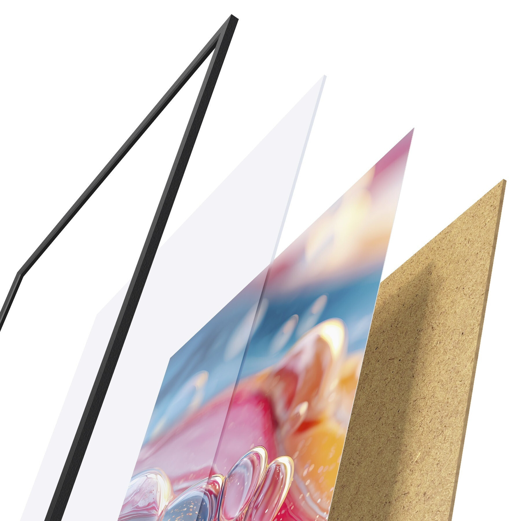Das Poster besteht aus einem Rahmen, Plexiglas, einem gedruckten Bild und einer Rückwand aus Spanplatten. Dank der Halterungen auf der Rückseite kann das Poster sofort an die Wand gehängt werden.