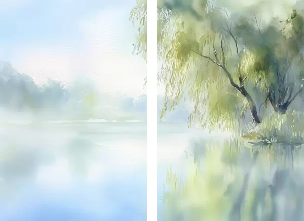 Poster weidenbaum am Seeufer im Aquarellstil d00702