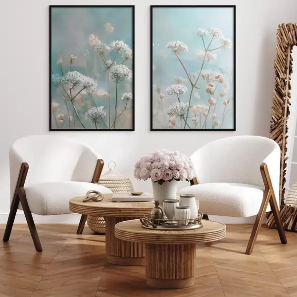 Poster Königin-Annes-Spitze-Blumen im Aquarellstil auf blauem Hintergrund d00705