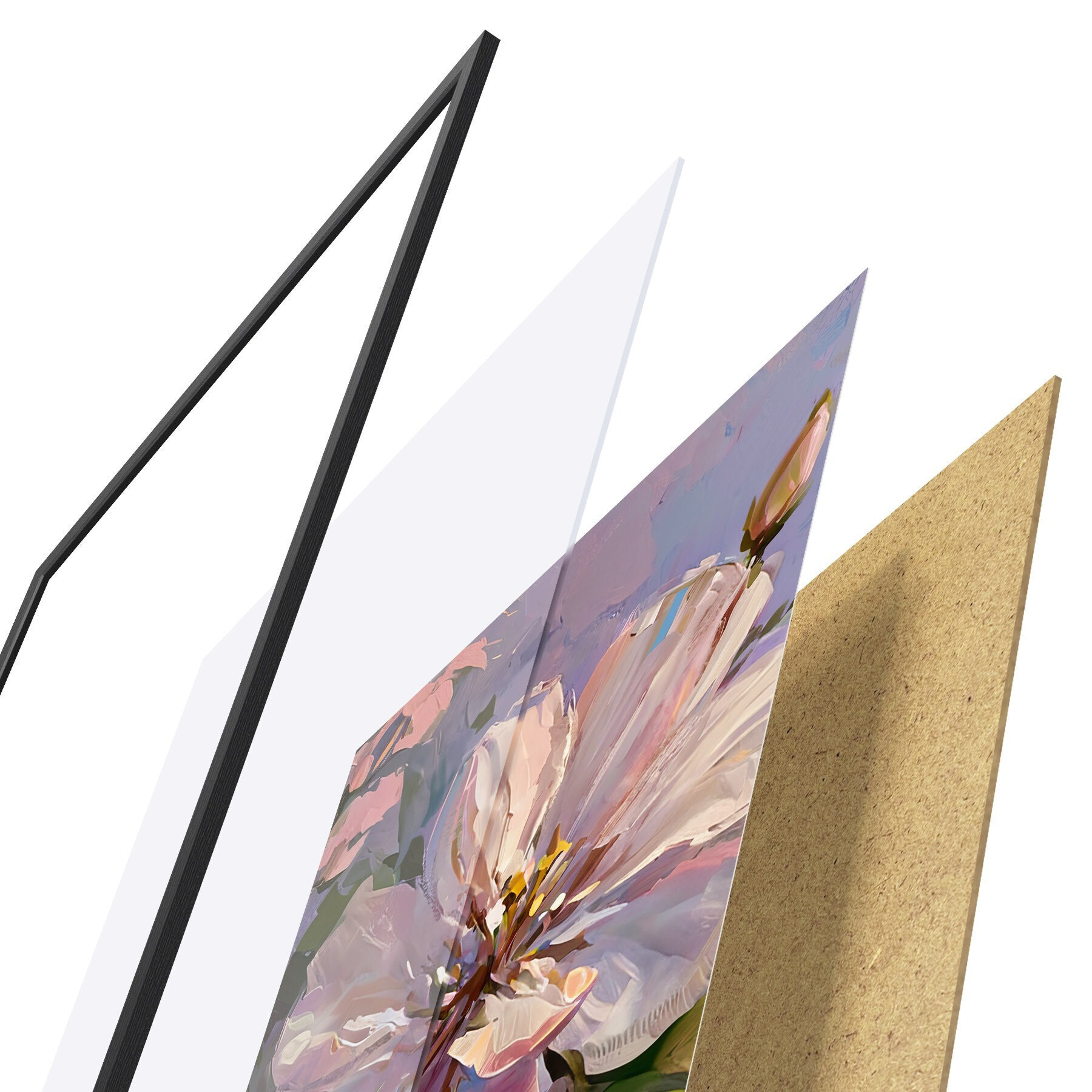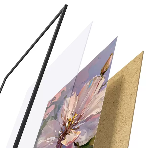 Das Poster besteht aus einem Rahmen, Plexiglas, einem gedruckten Bild und einer Rückwand aus Spanplatten. Dank der Halterungen auf der Rückseite kann das Poster sofort an die Wand gehängt werden.