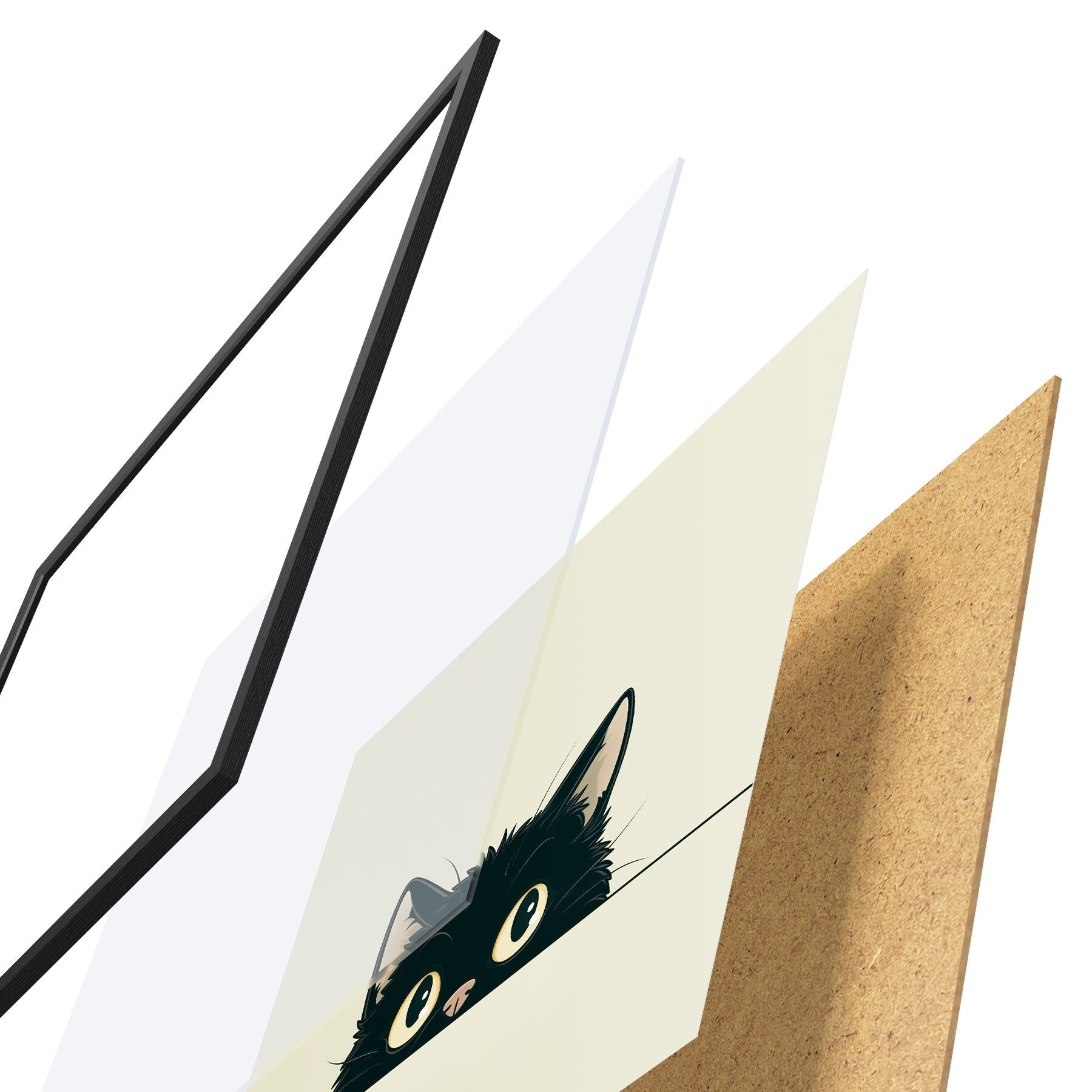 Das Poster besteht aus einem Rahmen, Plexiglas, einem gedruckten Bild und einer Rückwand aus Spanplatten. Dank der Halterungen auf der Rückseite kann das Poster sofort an die Wand gehängt werden.
