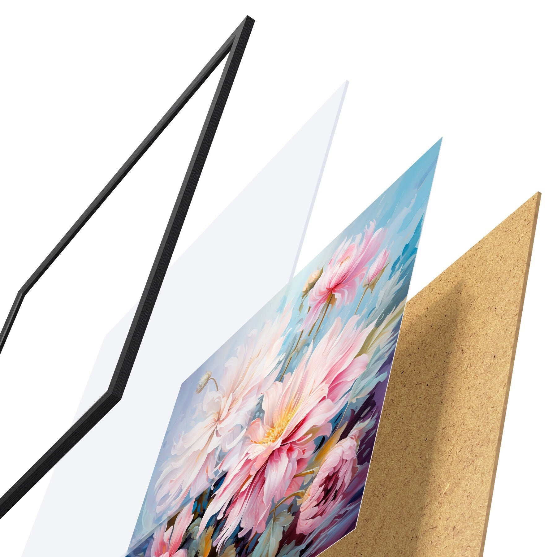 Das Poster besteht aus einem Rahmen, Plexiglas, einem gedruckten Bild und einer Rückwand aus Spanplatten. Dank der Halterungen auf der Rückseite kann das Poster sofort an die Wand gehängt werden.