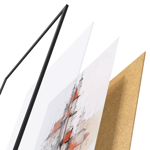 Das Poster besteht aus einem Rahmen, Plexiglas, einem gedruckten Bild und einer Rückwand aus Spanplatten. Dank der Halterungen auf der Rückseite kann das Poster sofort an die Wand gehängt werden.