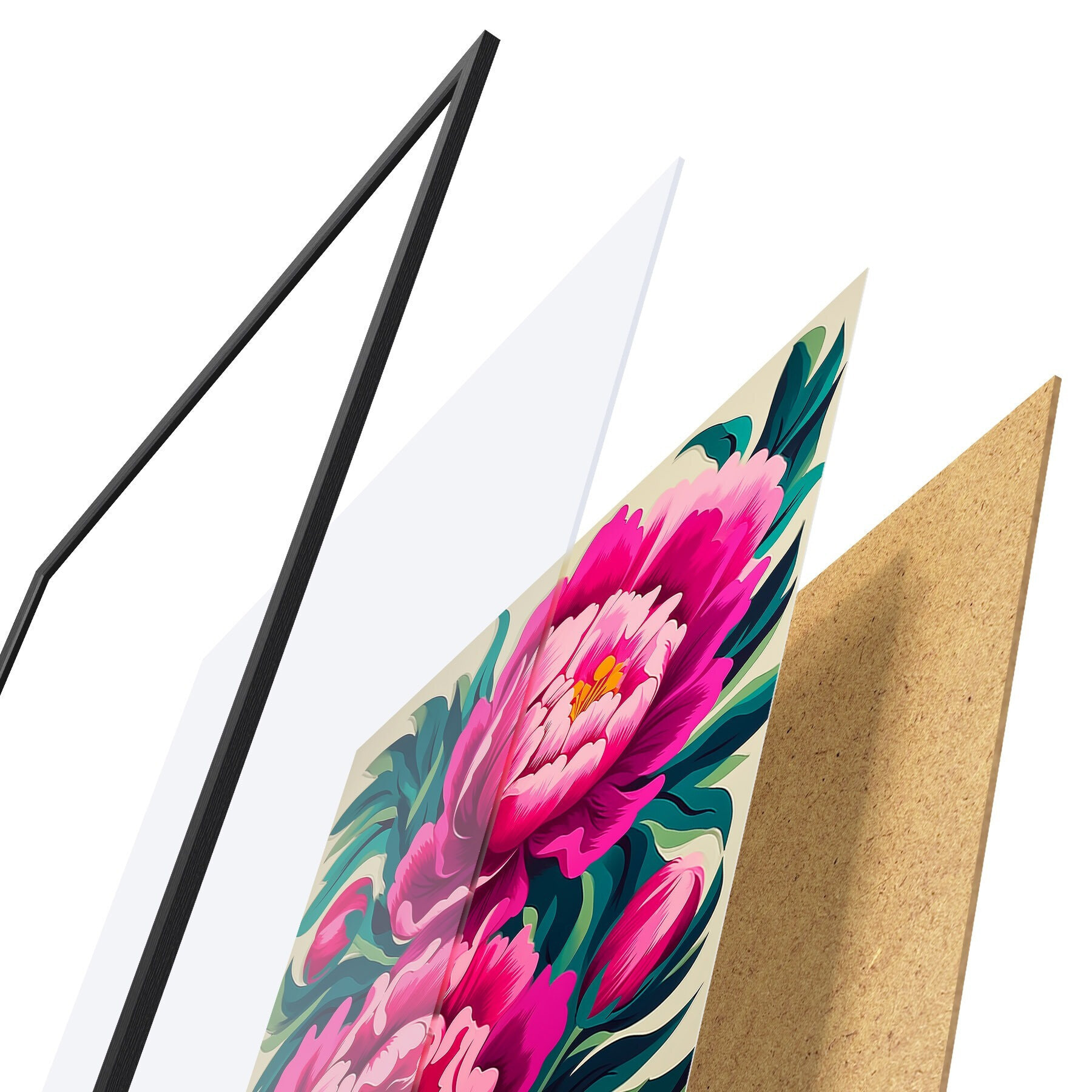Das Poster besteht aus einem Rahmen, Plexiglas, einem gedruckten Bild und einer Rückwand aus Spanplatten. Dank der Halterungen auf der Rückseite kann das Poster sofort an die Wand gehängt werden.