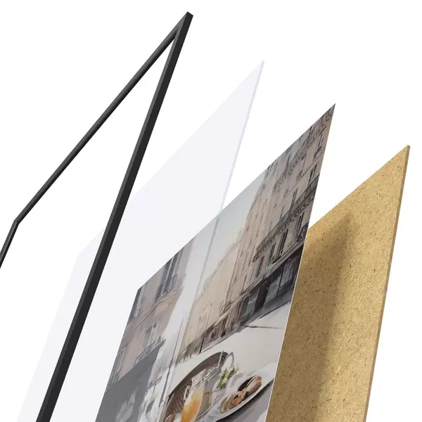 Das Poster besteht aus einem Rahmen, Plexiglas, einem gedruckten Bild und einer Rückwand aus Spanplatten. Dank der Halterungen auf der Rückseite kann das Poster sofort an die Wand gehängt werden.