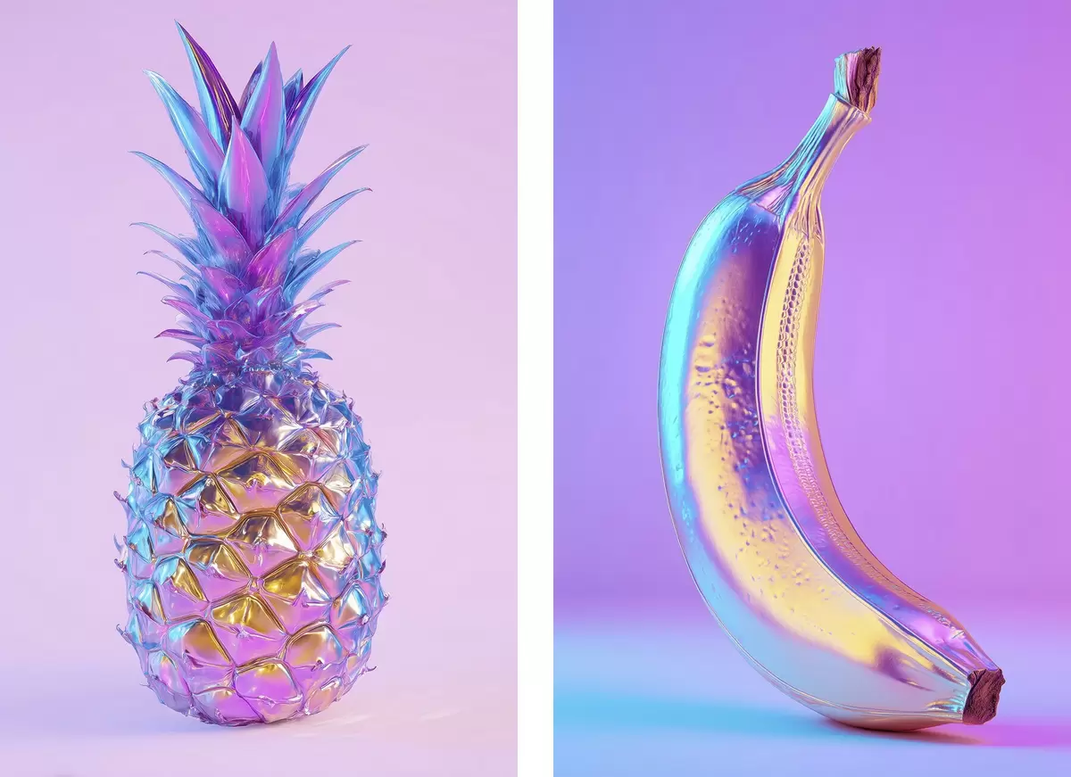 Poster leuchtend glänzende Ananas und Banane im Pop-Art-Stil d00737