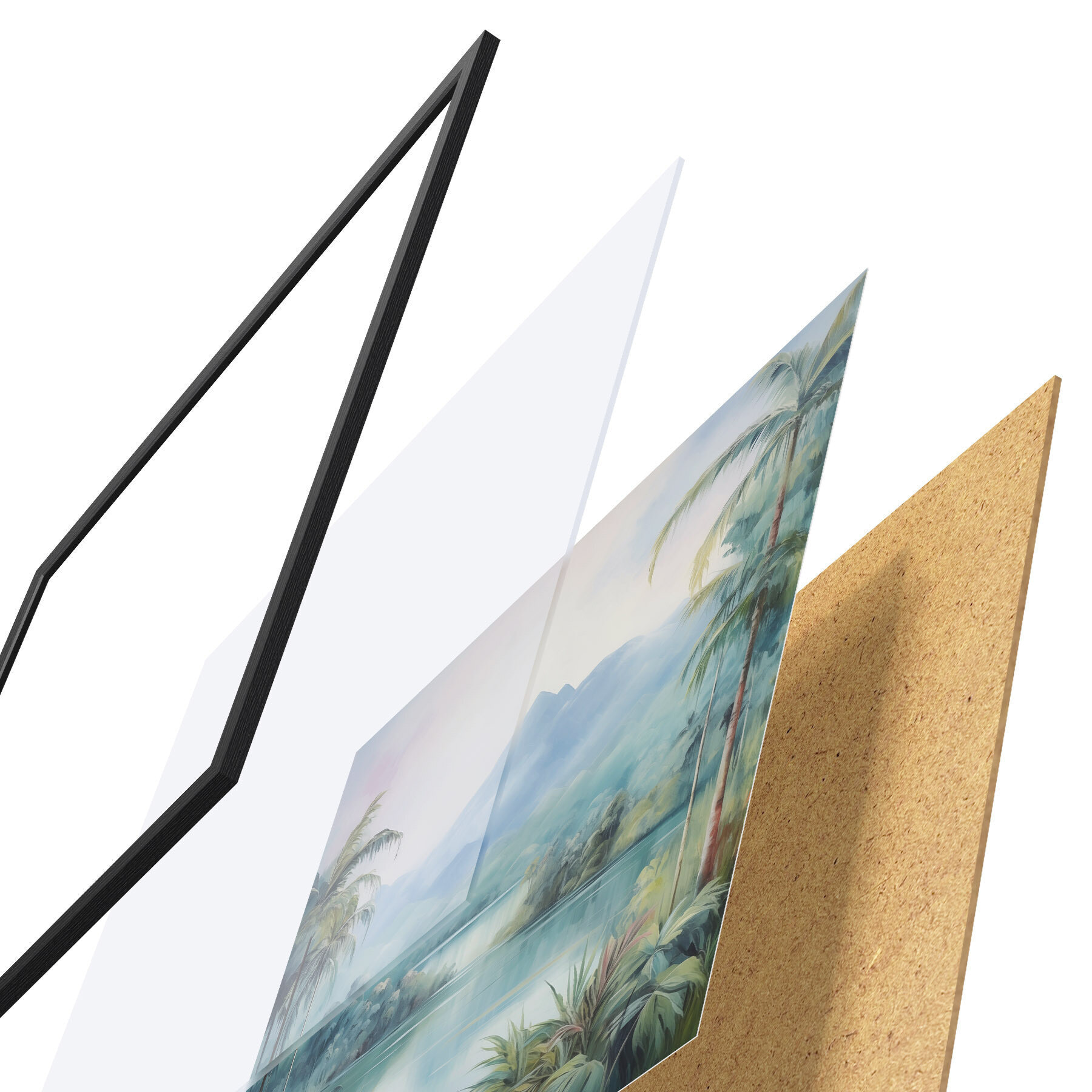 Das Poster besteht aus einem Rahmen, Plexiglas, einem gedruckten Bild und einer Rückwand aus Spanplatten. Dank der Halterungen auf der Rückseite kann das Poster sofort an die Wand gehängt werden.