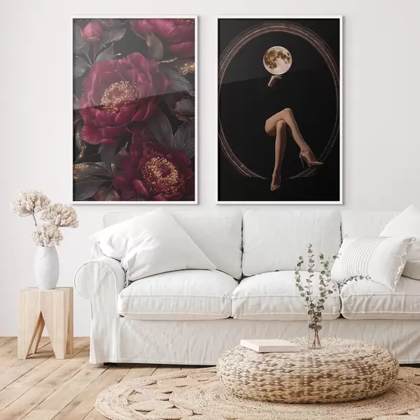 Poster Burgunderrote Pfingstrosen und eine mondförmige Silhouette auf schwarzem Hintergrund Nr d00765