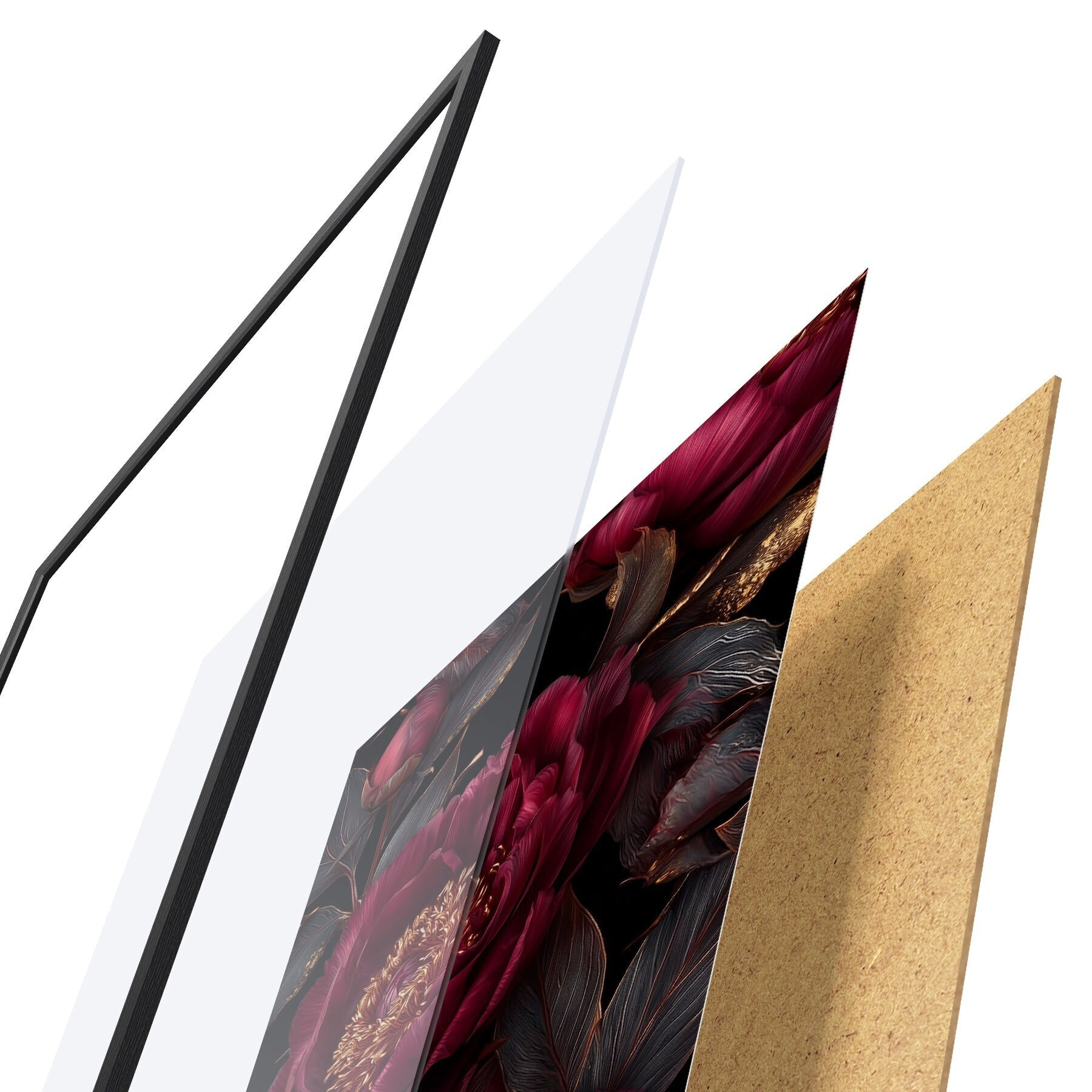 Das Poster besteht aus einem Rahmen, Plexiglas, einem gedruckten Bild und einer Rückwand aus Spanplatten. Dank der Halterungen auf der Rückseite kann das Poster sofort an die Wand gehängt werden.