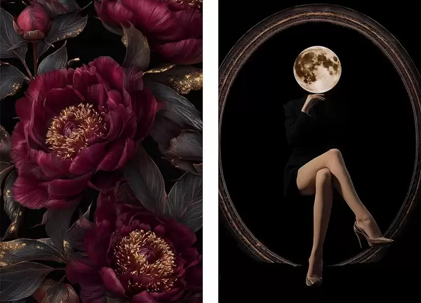 Poster Burgunderrote Pfingstrosen und eine mondförmige Silhouette auf schwarzem Hintergrund Nr d00765