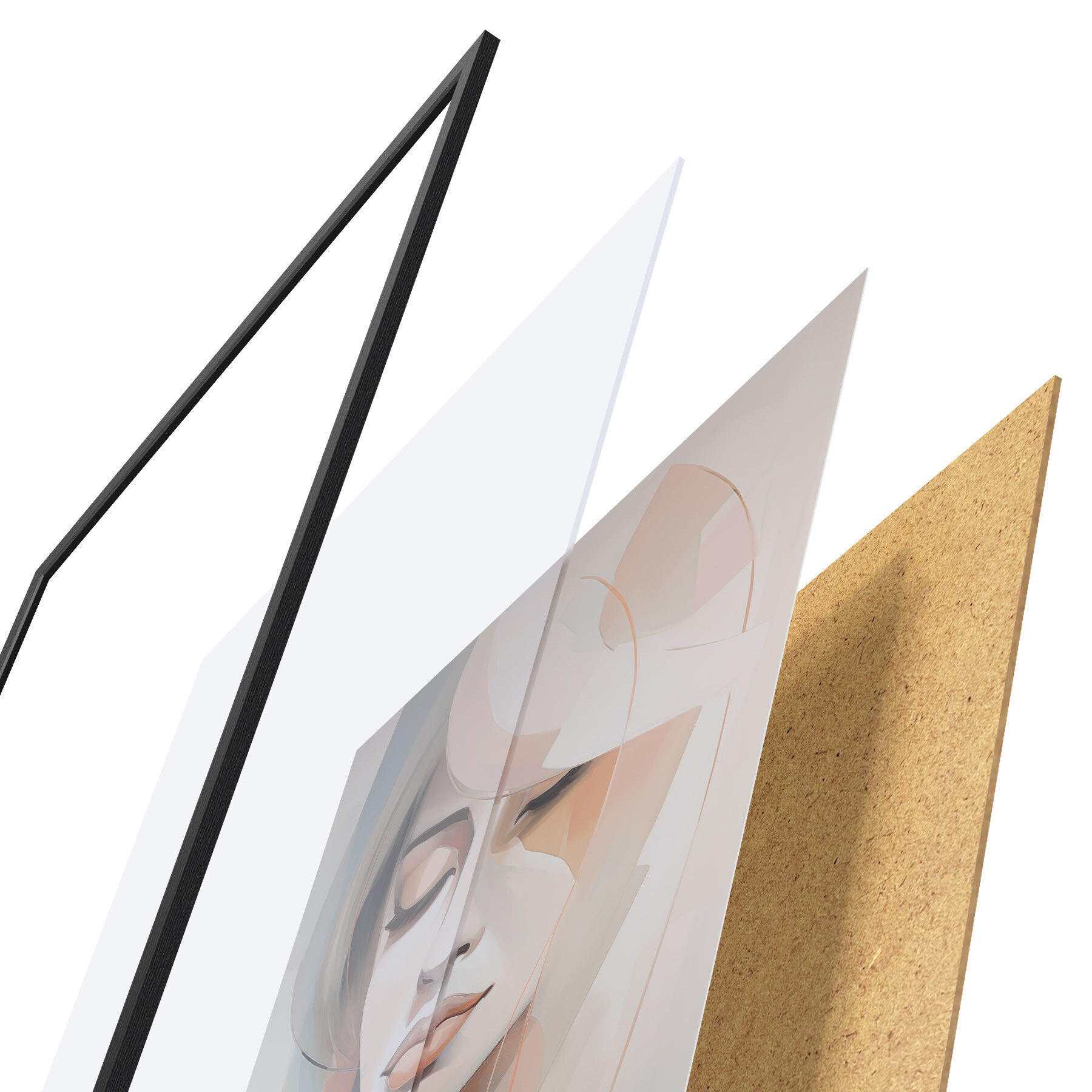 Das Poster besteht aus einem Rahmen, Plexiglas, einem gedruckten Bild und einer Rückwand aus Spanplatten. Dank der Halterungen auf der Rückseite kann das Poster sofort an die Wand gehängt werden.