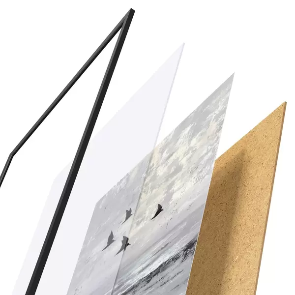 Das Poster besteht aus einem Rahmen, Plexiglas, einem gedruckten Bild und einer Rückwand aus Spanplatten. Dank der Halterungen auf der Rückseite kann das Poster sofort an die Wand gehängt werden.