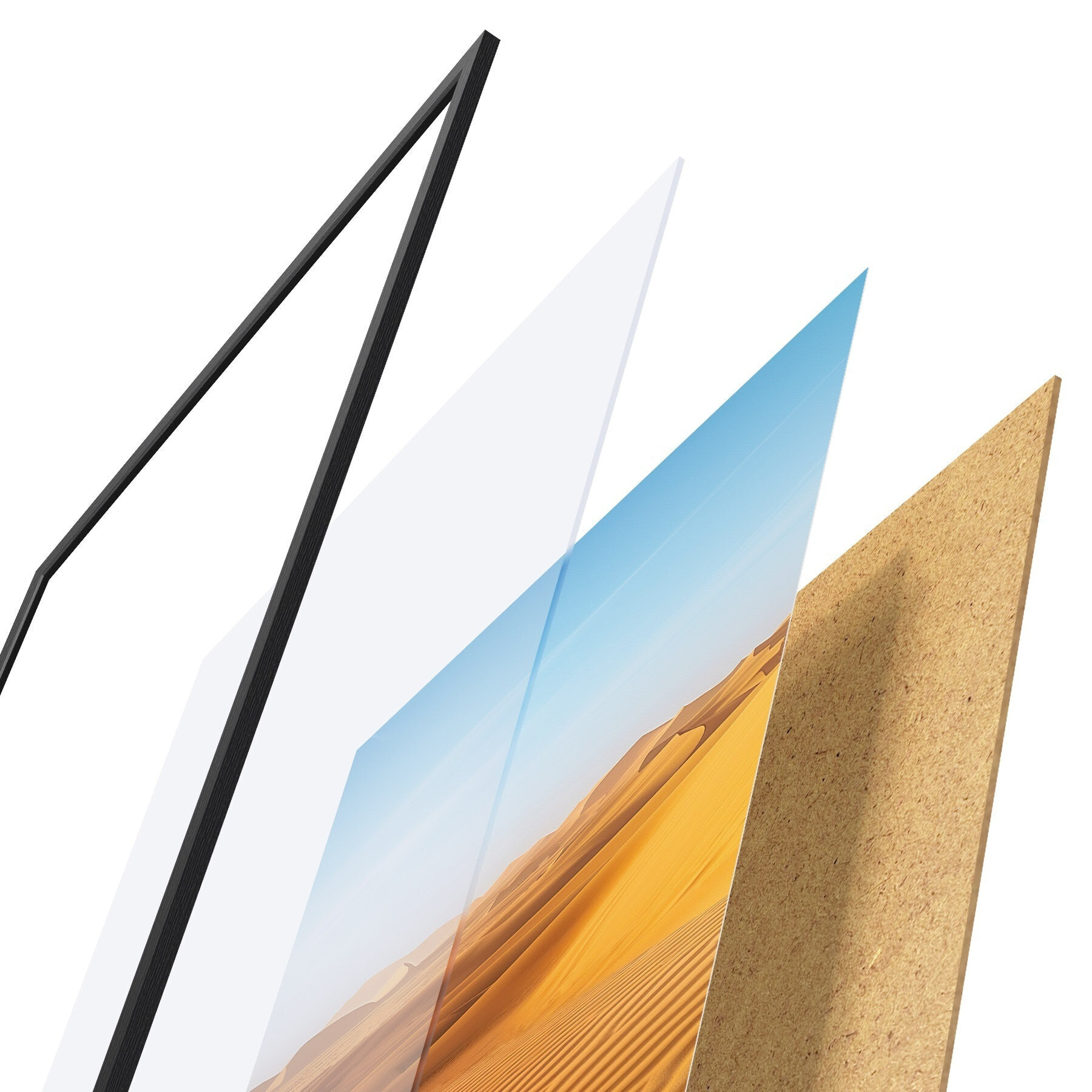 Das Poster besteht aus einem Rahmen, Plexiglas, einem gedruckten Bild und einer Rückwand aus Spanplatten. Dank der Halterungen auf der Rückseite kann das Poster sofort an die Wand gehängt werden.