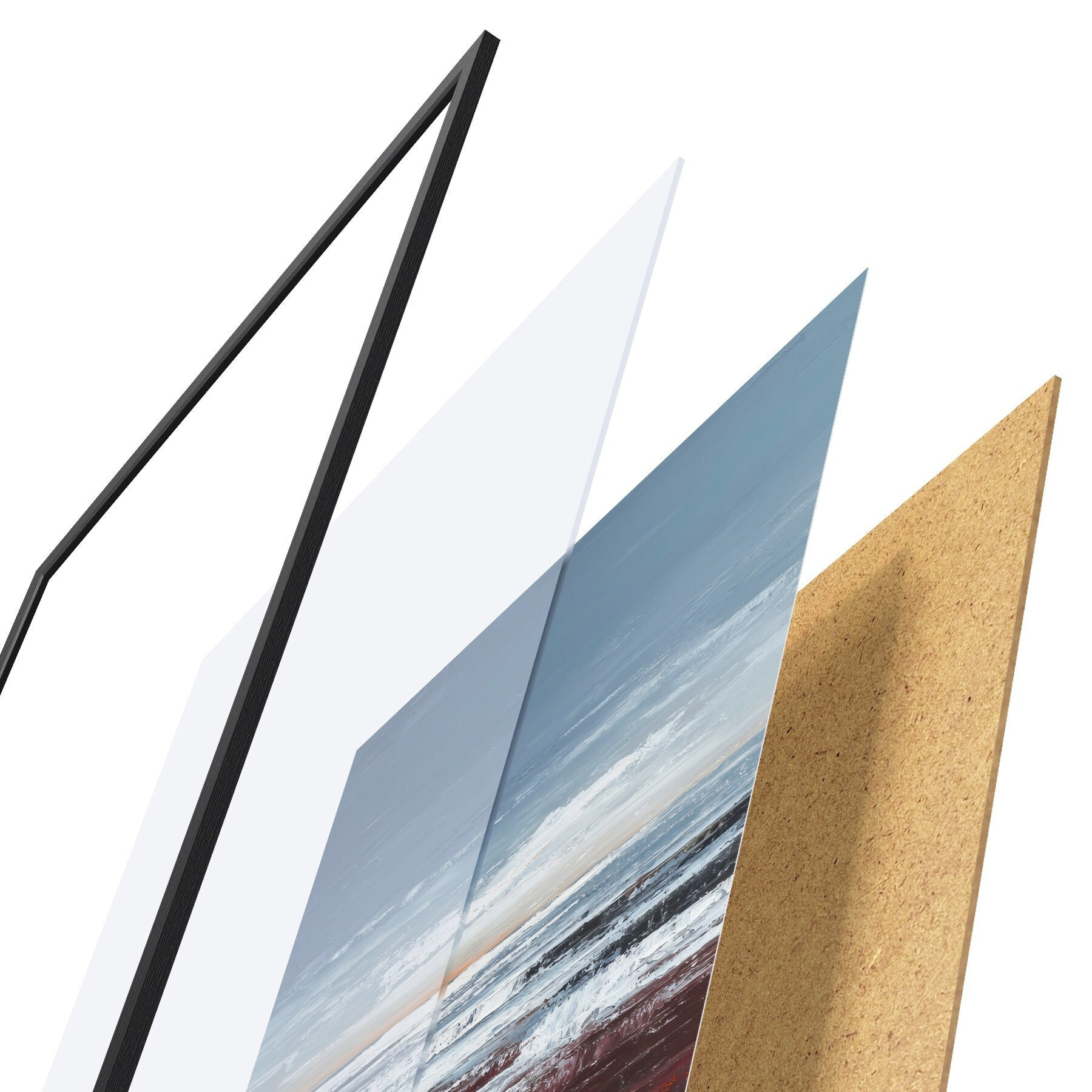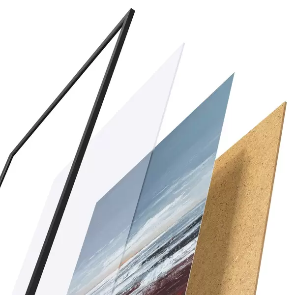 Das Poster besteht aus einem Rahmen, Plexiglas, einem gedruckten Bild und einer Rückwand aus Spanplatten. Dank der Halterungen auf der Rückseite kann das Poster sofort an die Wand gehängt werden.