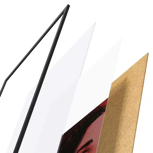 Das Poster besteht aus einem Rahmen, Plexiglas, einem gedruckten Bild und einer Rückwand aus Spanplatten. Dank der Halterungen auf der Rückseite kann das Poster sofort an die Wand gehängt werden.