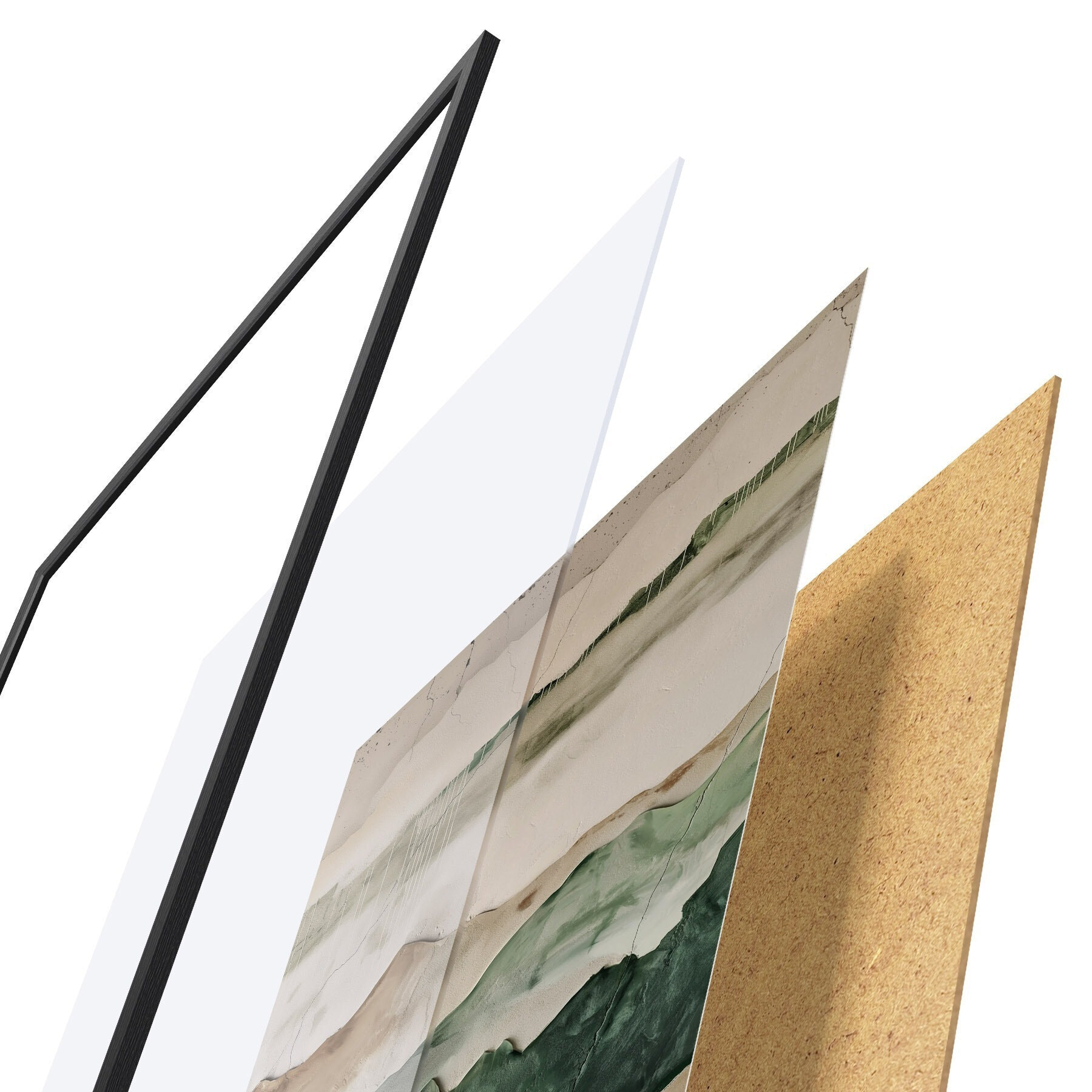 Das Poster besteht aus einem Rahmen, Plexiglas, einem gedruckten Bild und einer Rückwand aus Spanplatten. Dank der Halterungen auf der Rückseite kann das Poster sofort an die Wand gehängt werden.