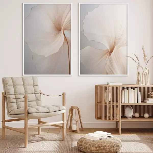 Poster Abstrakte Blumen mit dünnen, zarten Blütenblättern in Weiß- und Beigetönen Nr d00817