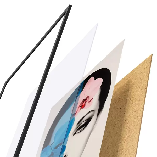 Das Poster besteht aus einem Rahmen, Plexiglas, einem gedruckten Bild und einer Rückwand aus Spanplatten. Dank der Halterungen auf der Rückseite kann das Poster sofort an die Wand gehängt werden.