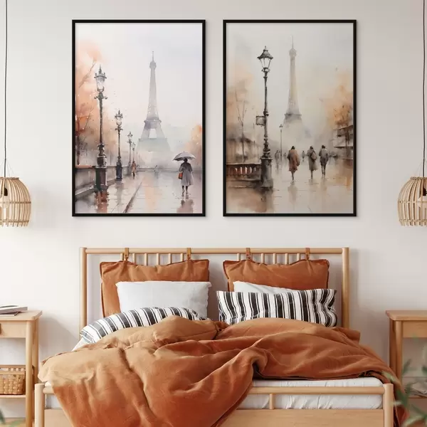 Poster Ein regnerischer Herbsttag in Paris mit dem Eiffelturm im Hintergrund und Vintage-Straßenlaternen d00821