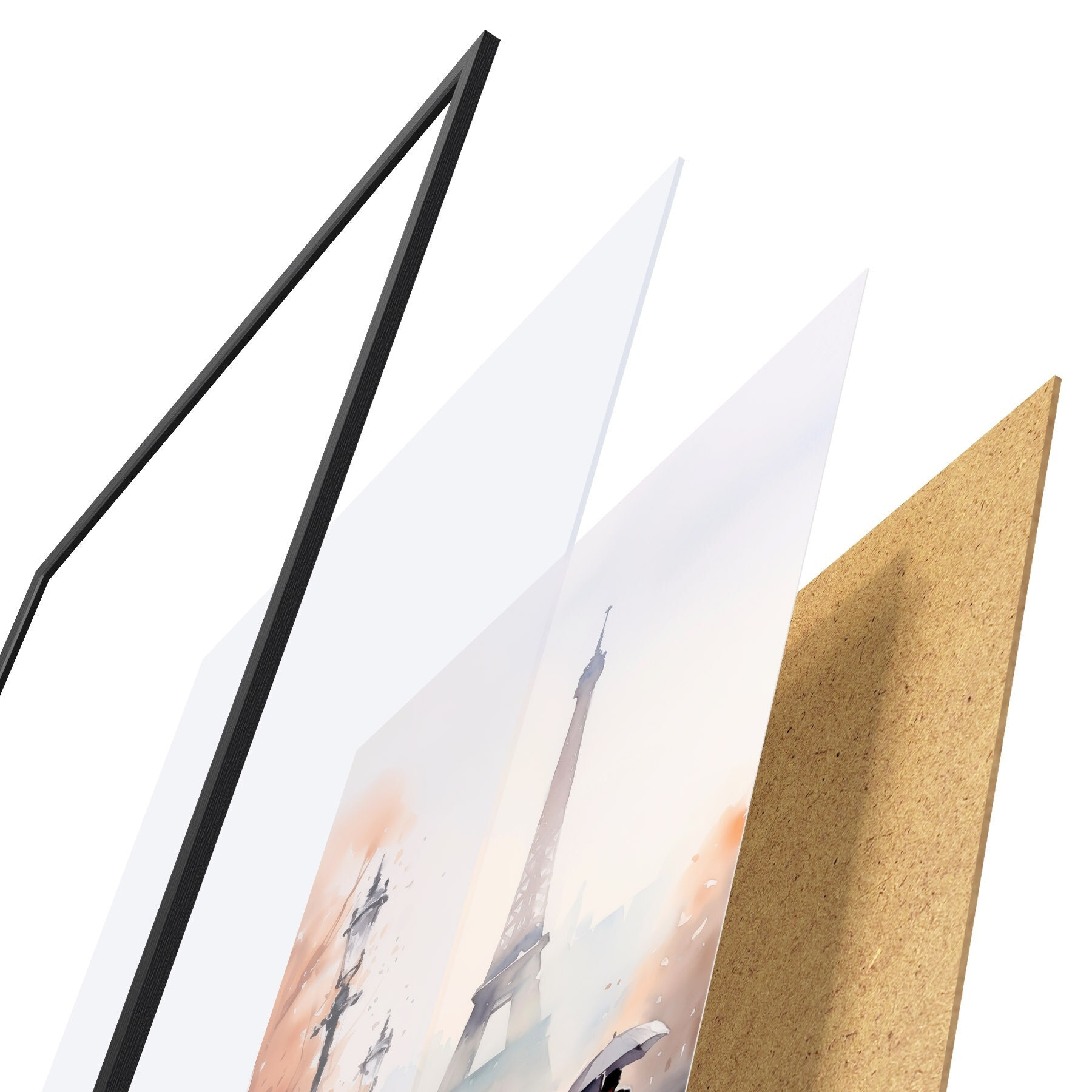 Das Poster besteht aus einem Rahmen, Plexiglas, einem gedruckten Bild und einer Rückwand aus Spanplatten. Dank der Halterungen auf der Rückseite kann das Poster sofort an die Wand gehängt werden.