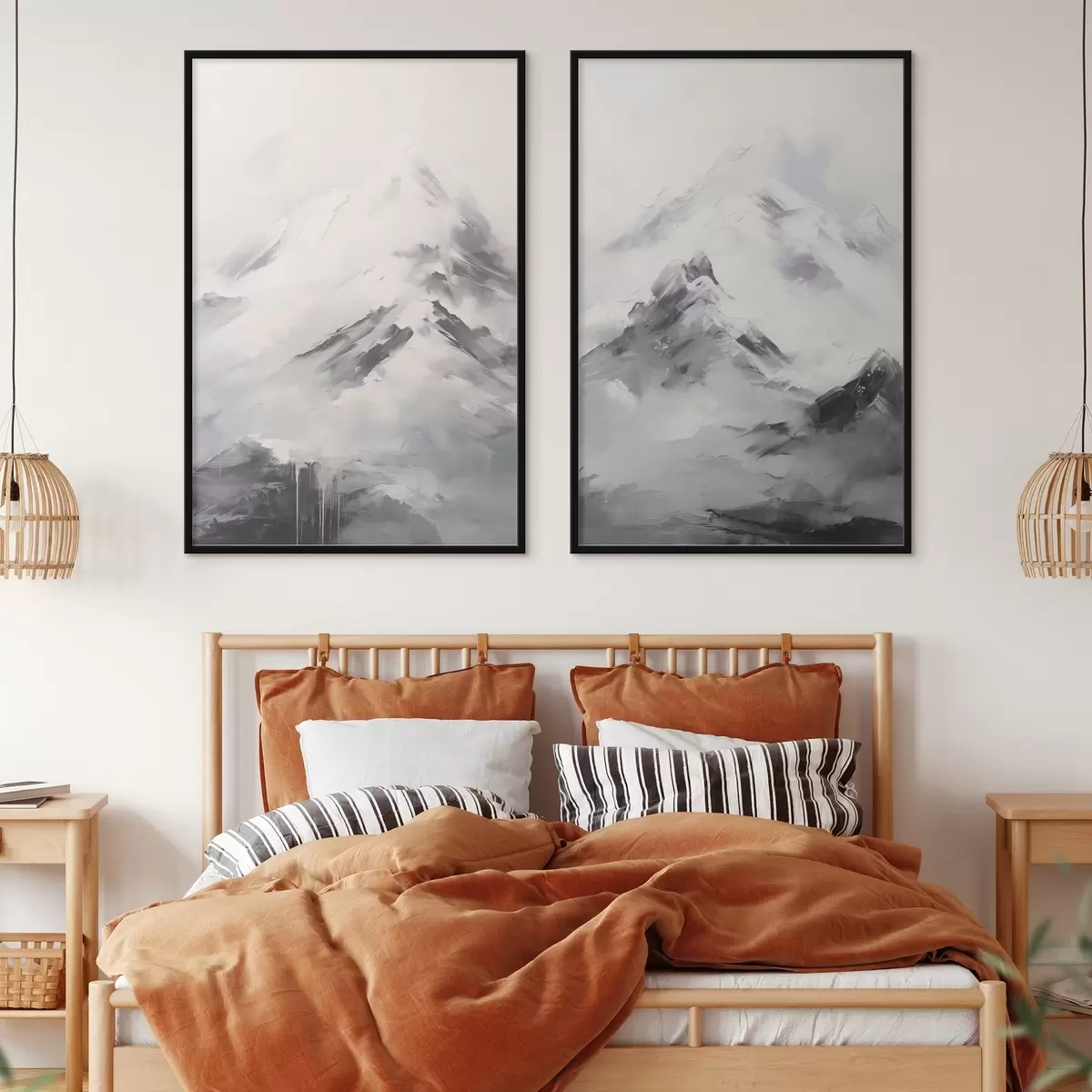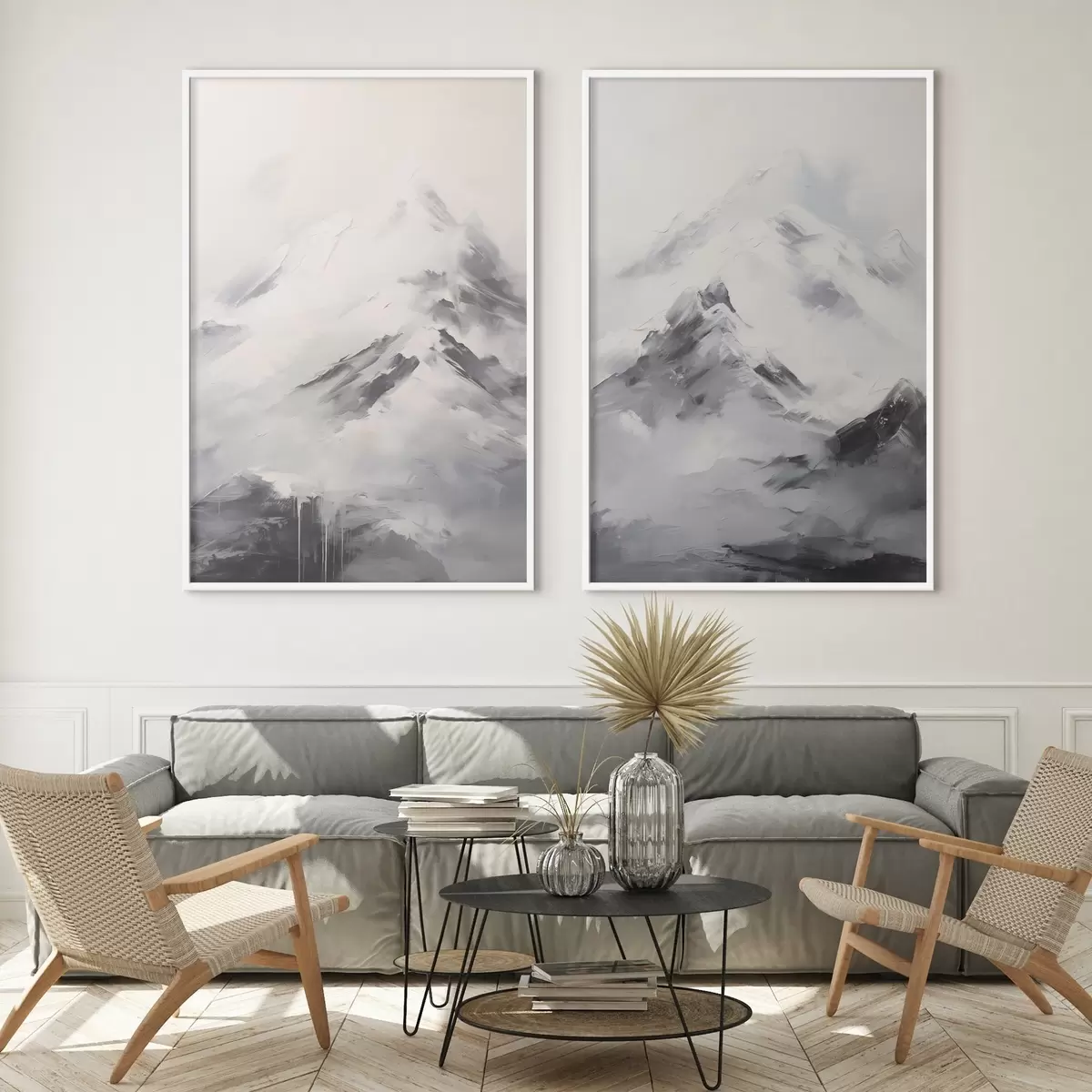 Poster Verschneite Berggipfel mit grauen Schatten, grauer Himmel, Pinselstriche, strukturiert, minimalistisch d00822