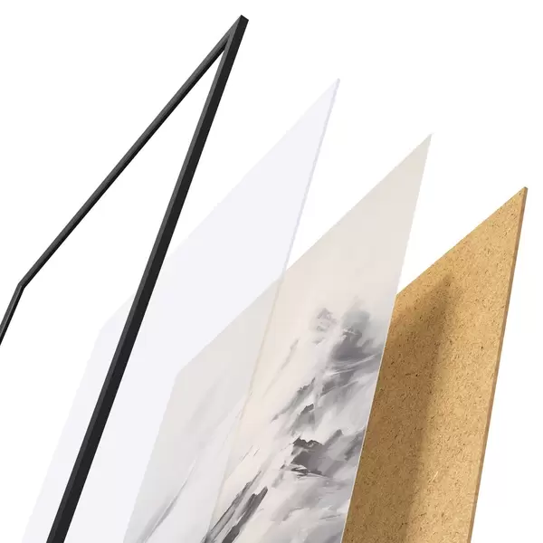 Das Poster besteht aus einem Rahmen, Plexiglas, einem gedruckten Bild und einer Rückwand aus Spanplatten. Dank der Halterungen auf der Rückseite kann das Poster sofort an die Wand gehängt werden.