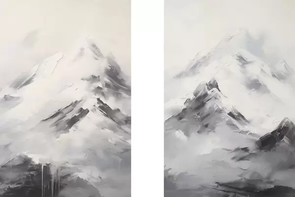 Poster Verschneite Berggipfel mit grauen Schatten, grauer Himmel, Pinselstriche, strukturiert, minimalistisch d00822