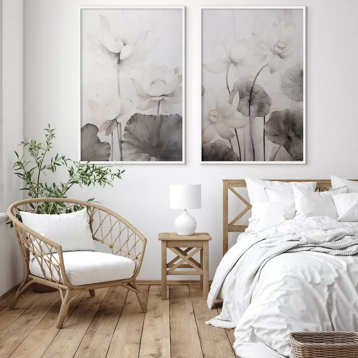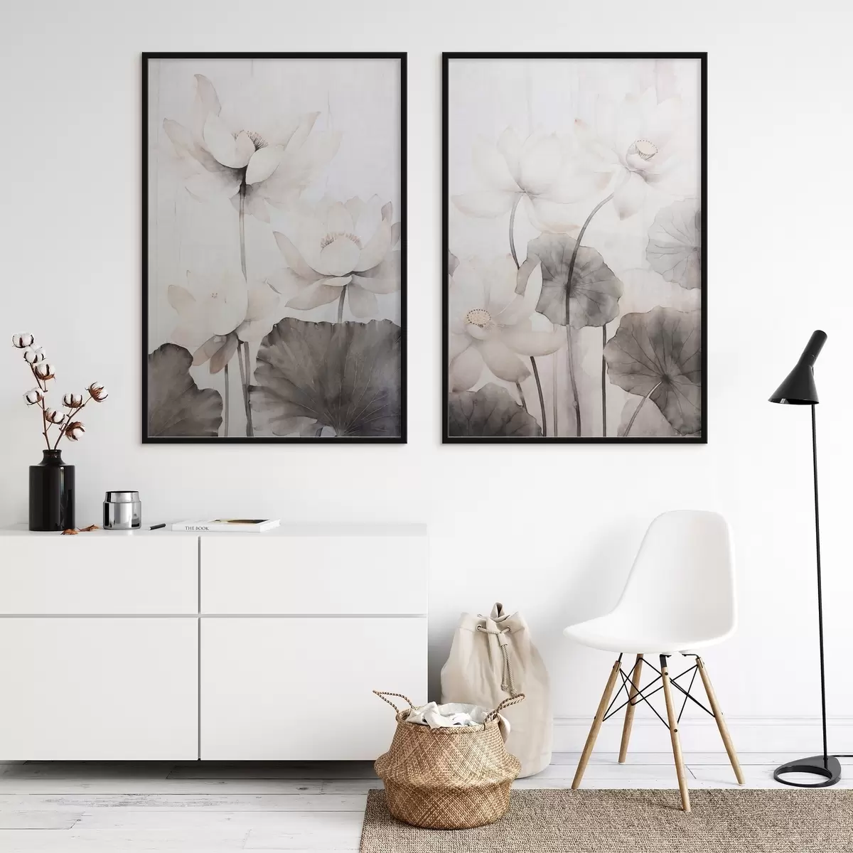 Poster Weiße Lotusblumen mit dunkler Blattstruktur, heller Hintergrund, minimalistisches Design Nr d00824