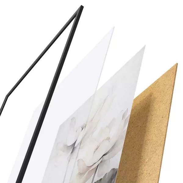 Das Poster besteht aus einem Rahmen, Plexiglas, einem gedruckten Bild und einer Rückwand aus Spanplatten. Dank der Halterungen auf der Rückseite kann das Poster sofort an die Wand gehängt werden.
