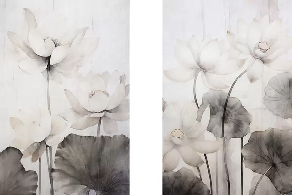 Poster Weiße Lotusblumen mit dunkler Blattstruktur, heller Hintergrund, minimalistisches Design Nr d00824